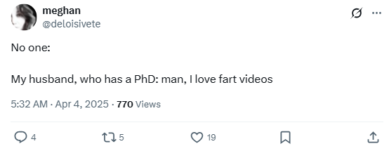 My husband, who has a PhD: man, I love fart videos”