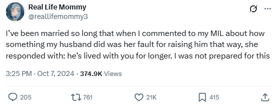 “I’ve been married so long that when I commented to my MIL about how something my husband did was her fault for raising him that way, she responded with: he’s lived with you for longer. I was not prepared for this.”