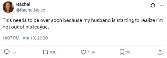 “This needs to be over soon because my husband is starting to realize I’m not out of his league.”