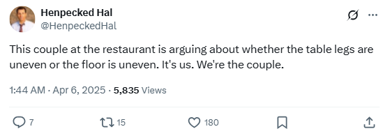“This couple at the restaurant is arguing about whether the table legs are uneven or the floor is uneven. It’s us. We’re the couple.”