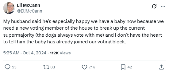 “My husband said he’s especially happy we have a baby now because we need a new voting member of the house to break up the current supermajority (the dogs always vote with me) and I don’t have the heart to tell him the baby has already joined our voting block.”