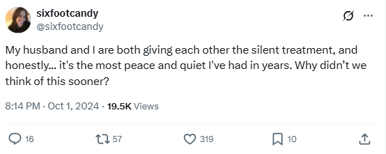“My husband and I are both giving each other the silent treatment, and honestly… it’s the most peace and quiet I’ve had in years. Why didn’t we think of this sooner?”