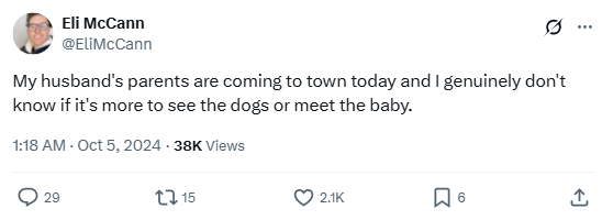 “My husband’s parents are coming to town today and I genuinely don’t know if it’s more to see the dogs or meet the baby.”