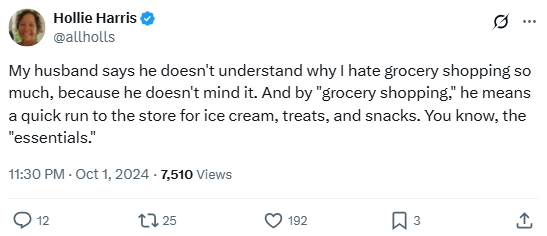 “My husband says he doesn’t understand why I hate grocery shopping so much, because he doesn’t mind it. And by ‘grocery shopping,’ he means a quick run to the store for ice cream, treats, and snacks. You know, the ‘essentials.'”