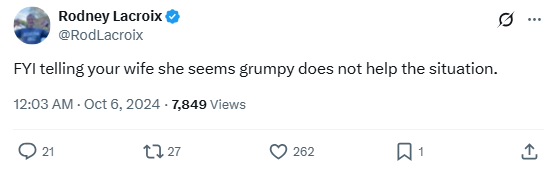 “FYI telling your wife she seems grumpy does not help the situation.”