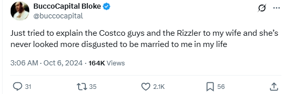 “Just tried to explain the Costco guys and the Rizzler to my wife and she’s never looked more disgusted to be married to me in my life.”