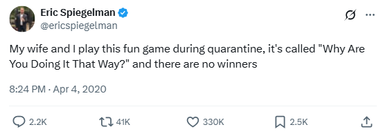 “My wife and I play this fun game during quarantine, it’s called ‘Why Are You Doing It That Way?’ and there are no winners.”