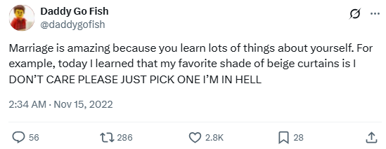 “Marriage is amazing because you learn lots of things about yourself. For example, today I learned that my favorite shade of beige curtains is I DON’T CARE PLEASE JUST PICK ONE I’M IN HELL”