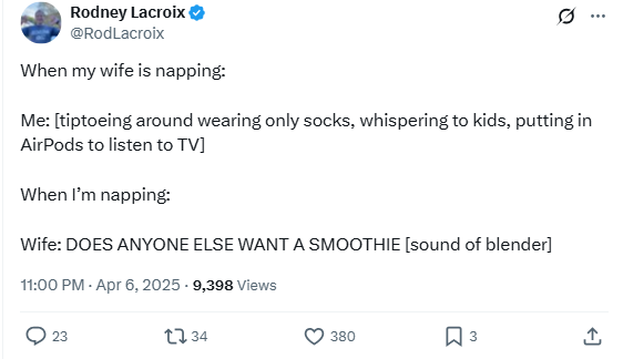 Wife: DOES ANYONE ELSE WANT A SMOOTHIE [sound of blender]”