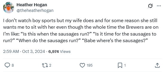 “I don’t watch boy sports but my wife does and for some reason she still wants me to sit with her even though the whole time the Brewers are on I’m like: “Is this when the sausages run?” “Is it time for the sausages to run?” “When do the sausages run?” “Babe where’s the sausages?””