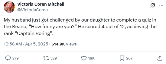“My husband just got challenged by our daughter to complete a quiz in the Beano, ‘How funny are you?’ He scored 4 out of 12, achieving the rank ‘Captain Boring’.”