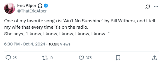 “One of my favorite songs is ‘Ain’t No Sunshine’ by Bill Withers, and I tell my wife that every time it’s on the radio. She says, ‘I know, I know, I know, I know, I know…'”