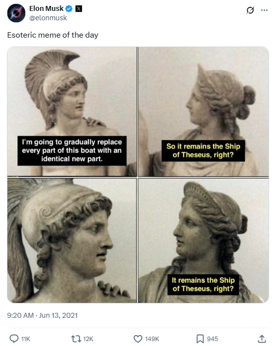 Labeling it “Esoteric meme of the day,” Musk dives into ancient philosophical territory with a modern meme twist. The Ship of Theseus paradox asks whether something that has had all its components replaced remains fundamentally the same. It’s a smart—and subtly hilarious—nod to identity, change, and maybe even corporate restructuring.