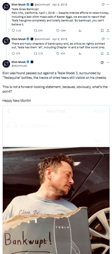 Musk’s infamous April Fools’ joke about Tesla going bankrupt was hilariously self-deprecating—especially considering the company’s rocky financial past. Complete with fictional tears and “Teslaquilla,” the post blurred the line between parody and too-real reality.