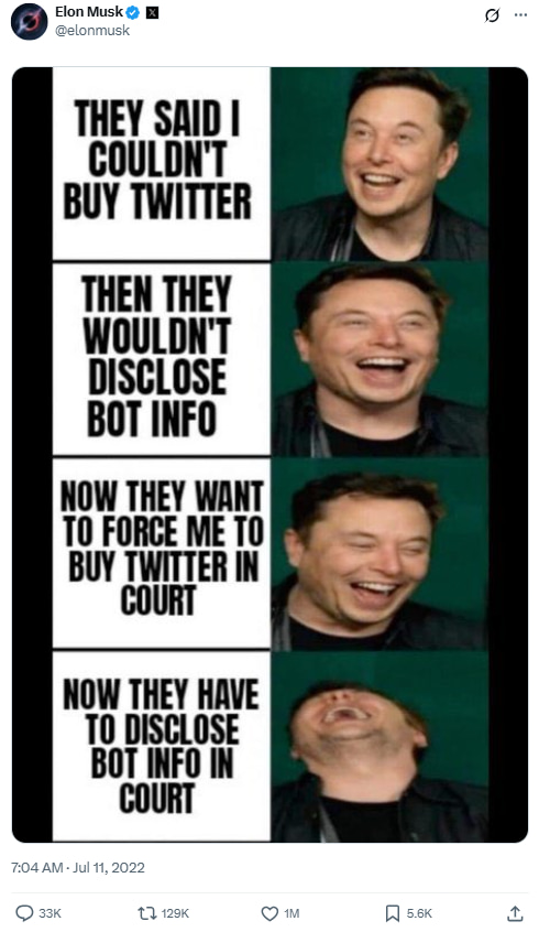This meme shows Musk’s signature move: blending sarcasm with legal drama. Posted during the back-and-forth over the Twitter acquisition, it turns the chaos into comedy. Musk plays the long game, mocking the twists and turns of his own billion-dollar deal.