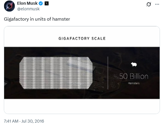 15. “Gigafactory in units of hamster”
