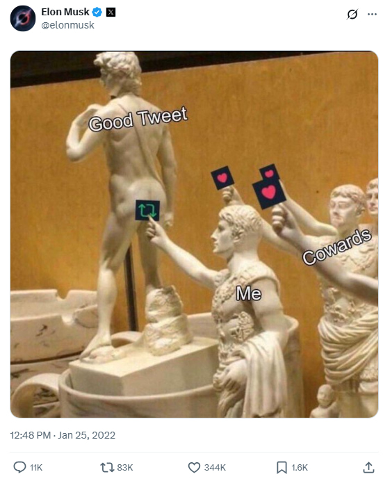 In this tweet, Musk shares a meme using classical statues to call out people who like tweets but never retweet them. Labeling himself as the only one hitting the retweet button while others just tap the like icon, the image humorously criticizes passive social media behavior. It’s a simple post, but one that plays into the dynamics of Twitter engagement—and Elon’s habit of pushing people to act, not just observe.