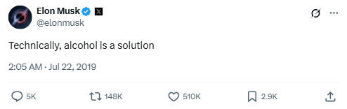 Classic Elon—science nerd meets internet humor. Here, he plays with the double meaning of “solution,” mixing chemistry with a hint of wordplay that’s both clever and chuckle-worthy.
