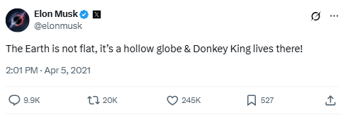 Taking a shot at flat-earthers and adding a fictional monarch to the mix, this tweet shows Musk’s love of absurd humor. His version of Earth? A hollow globe ruled by… Donkey King.