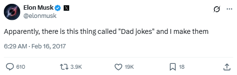 Known for his dry wit and cringeworthy puns, Musk took to Twitter to crowdsource “Dad jokes”—proving he doesn’t take himself too seriously and is perfectly comfortable embarrassing his kids with corny humor.