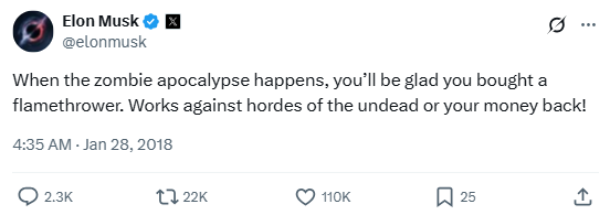 Musk turned heads when he launched The Boring Company by selling actual flamethrowers—and promoting them like doomsday essentials. He kept the bit going on Twitter, suggesting they’d be a wise investment in case of a full-on undead invasion. It was part sales pitch, part sci-fi gag, all wrapped in Elon-style chaos.
