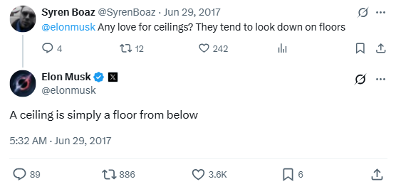 The great thing about Elon Musk’s Twitter account is his commitment to replying to many tweets directed at him. Sometimes this results in him offering to help the people in Flint with their water problems, other times he offers some totally bizarre insight into seeing the world from another perspective.