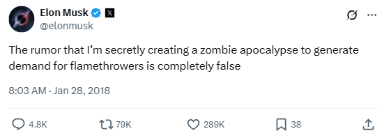 After fueling wild speculation with flamethrower sales, Musk leaned into the absurdity with a tongue-in-cheek denial. It was classic Elon—poking fun at conspiracy theories while keeping the entertainment going for his massive Twitter audience.