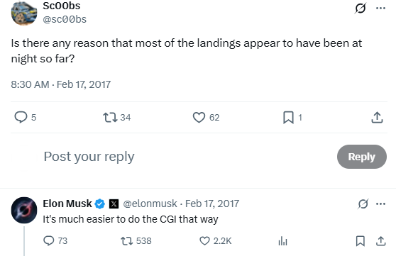In response to a question about nighttime rocket landings, Elon casually trolls conspiracy theorists with a CGI joke. Classic dry sarcasm.