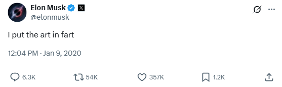 Only Elon could turn a fart joke into a comment on creativity. This tweet is both crude and clever, using simple humor to highlight his unusual style.
