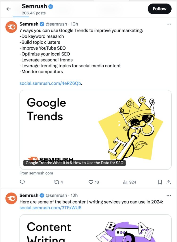 If you open Twitter and check out the accounts of popular brands, you’ll notice that every successful account posts with a consistent rhythm. Amazon makes a couple of posts a day and then takes a day off. Semrush does 4-6 posts each day. You need that rhythm too.