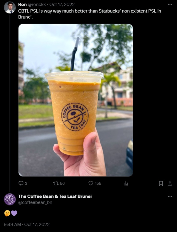 For example, a customer might post a comparison between two brands, as seen in a tweet where a user praises Coffee Bean & Tea Leaf’s PSL (Pumpkin Spice Latte) over Starbucks’ non-existent version in Brunei. By tracking this kind of mention, a business can gather valuable insights about how customers perceive their offerings in relation to competitors.