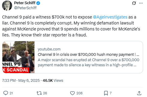 Peter Schiff claims Channel 9 paid $700K to silence a witness in his defamation case, accusing the network of protecting false reporting. His post references a legal victory tied to misleading coverage of Euro Pacific Bank and criticizes Channel 9’s ethical standards, linking it to a wider pattern of misconduct documented in recent media investigations.