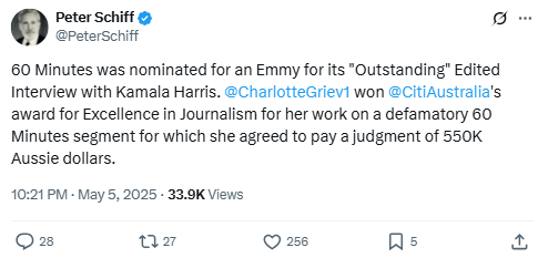 Peter Schiff criticizes 60 Minutes for receiving an Emmy nomination while highlighting journalist Charlotte Grieve’s defamation settlement over a related segment. He questions media credibility and underscores tensions between award recognition and legal accountability in journalism, reinforcing his broader skepticism toward media integrity.