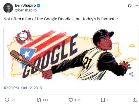 In a departure from his usual criticism of tech companies, Shapiro praised Google’s October 12, 2018 Doodle honoring Roberto Clemente. The image featured Clemente in action, superimposed over Puerto Rico with his iconic number 21 and the island’s flag—symbolizing both his athletic excellence and cultural legacy. Clemente, celebrated for his humanitarian work and 18-season MLB career with the Pittsburgh Pirates, was the namesake of the prestigious Roberto Clemente Award. Shapiro’s post acknowledged the Doodle’s powerful tribute to a sports and civil icon.