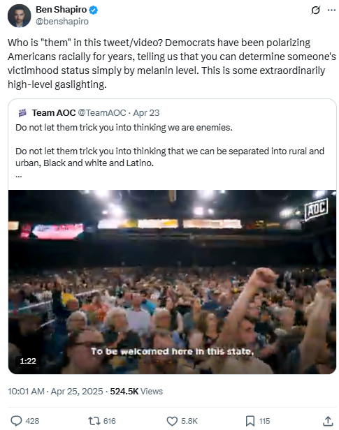 Shapiro responded to a clip from Alexandria Ocasio-Cortez (AOC), in which she warned against divisive tactics. He criticized the vagueness of “them” and accused Democrats of racial polarization through identity politics. The tweet gained attention for challenging AOC’s framing of unity and division.