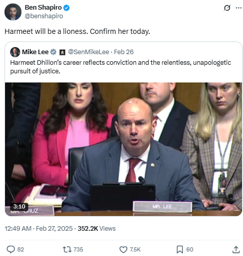 Shapiro urged the Senate to confirm Harmeet Dhillon as Assistant Attorney General for Civil Rights, citing her fierce advocacy, as emphasized by Sen. Mike Lee. Dhillon, a controversial Trump nominee, has sparked debate over her comments on Khalistan and her alignment with Trump’s agenda to refocus the Justice Department on voter fraud and religious discrimination. Her nomination represents a broader conservative push to reframe civil rights enforcement.