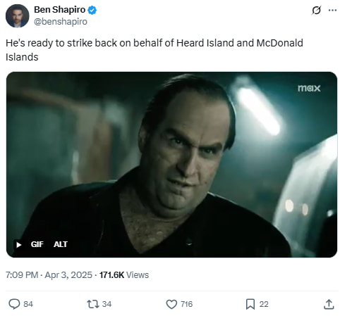 Shapiro’s caption is likely a satirical jab, poking fun at how seriously some take obscure geopolitical issues. By pairing a menacing fictional gangster with barren volcanic islands, he creates a humorous contrast, though a few interpreted it literally.