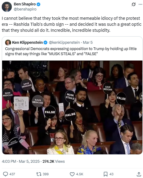 After Congressional Democrats held signs like “MUSK STEALS” and “FALSE” during Trump’s March 4 speech, Shapiro called it “memeable idiocy,” likening it to a previous protest by Rep. Rashida Tlaib. The signs were aimed at Elon Musk’s controversial role in U.S. Treasury payments.