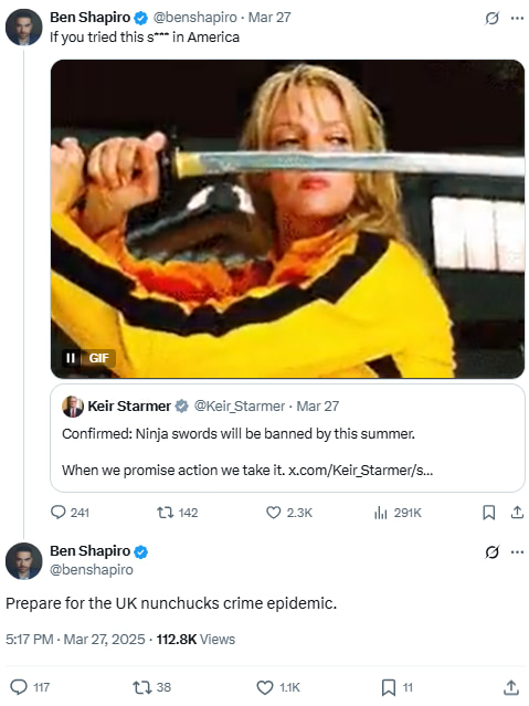 Shapiro was reacting to UK Labour leader Keir Starmer’s announcement that ninja swords would be banned in an effort to curb violent crime. Shapiro sarcastically predicted that criminals would simply switch to nunchucks—a martial arts weapon already restricted in the UK since the 1980s.