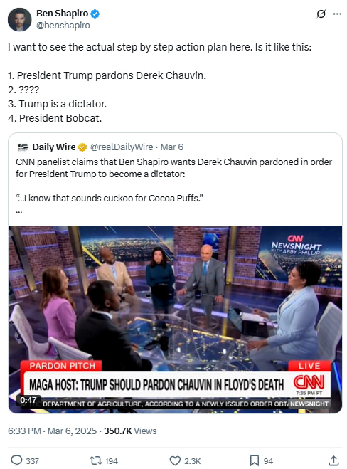 This post ridicules a CNN panelist who claimed Shapiro’s support for Derek Chauvin’s pardon was part of a plot to install Trump as a dictator. Shapiro mocks the logic with a sarcastic “plan” ending in absurdity—“President Bobcat.” It builds on his ongoing campaign arguing Chauvin’s conviction was politically motivated, citing drug levels in George Floyd’s system. However, medical consensus maintained Floyd died from neck compression, not an overdose.