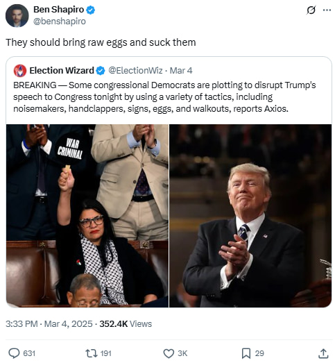 Reacting to reports that Democrats planned to disrupt Trump’s March 4 speech with props like eggs and noisemakers, Shapiro sarcastically suggested they “suck them,” mocking the absurdity of such tactics in a formal setting. His comment alludes to past protest moments like Rashida Tlaib’s “war criminal” sign, and frames these disruptions as childish and unserious, despite real legal risks tied to such acts during official proceedings.