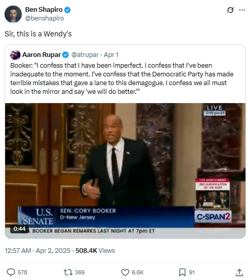 Shapiro’s tweet was a response to a post by journalist Aaron Rupar, who shared a clip of Sen. Cory Booker (D-NJ) delivering an emotional speech in the Senate. In his remarks, Booker admitted to personal and Democratic Party failures, stating: “I confess that I have been imperfect. I confess that I’ve been inadequate to the moment. I confess that the Democratic Party has made terrible mistakes that gave a lane to this demagogue. I confess we all must look in the mirror and say ‘we will do better.'”