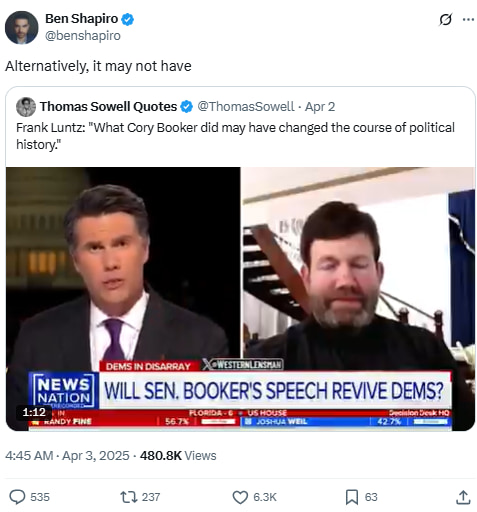 This short reply mocks a post quoting Frank Luntz, who claimed Cory Booker’s 25-hour speech “may have changed the course of political history.” Shapiro’s terse response dismisses that idea, suggesting the speech was forgettable despite its record-breaking length.