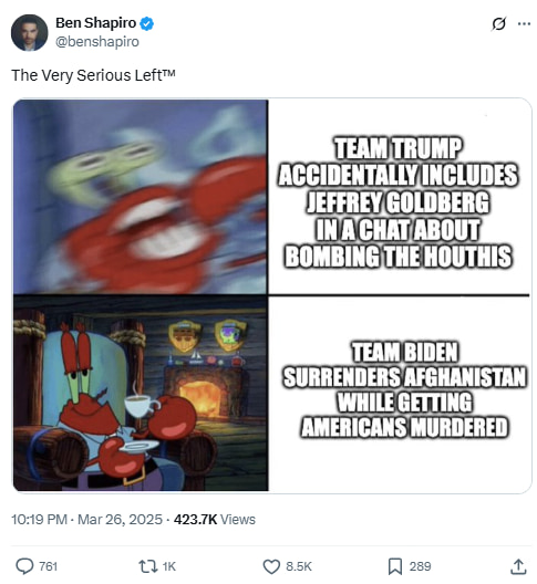 In this tweet, Shapiro uses a SpongeBob meme format to mock what he sees as disproportionate scrutiny of Republican versus Democratic controversies. He contrasts Team Trump’s accidental inclusion of journalist Jeffrey Goldberg in a Signal chat about bombing Houthi targets with Team Biden’s chaotic 2021 withdrawal from Afghanistan, which led to 13 American deaths at Kabul airport.