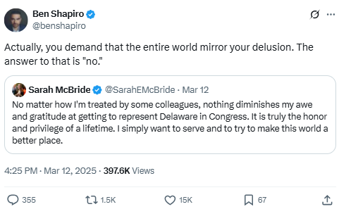 8. “Actually, You Demand the World Mirror Your Delusion” – Shapiro Clashes with Trans Rep. Sarah McBride