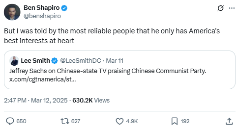 Shapiro sarcastically commented on economist Jeffrey Sachs’ appearance on Chinese state television (CGTN), where Sachs praised China’s Belt and Road Initiative (BRI). The BRI has invested over $1 trillion in global infrastructure since 2013 but faces criticism for creating “debt traps” in developing nations.