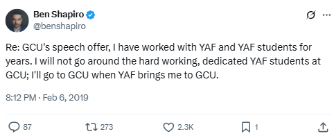 “Re: GCU’s speech offer, I have worked with YAF and YAF students for years. I will not go around the hard working, dedicated YAF students at GCU; I’ll go to GCU when YAF brings me to GCU.”