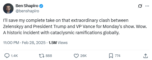 “I’ll save my complete take on that extraordinary clash between Zelenskyy and President Trump and VP Vance for Monday’s show. Wow. A historic incident with cataclysmic ramifications globally.”