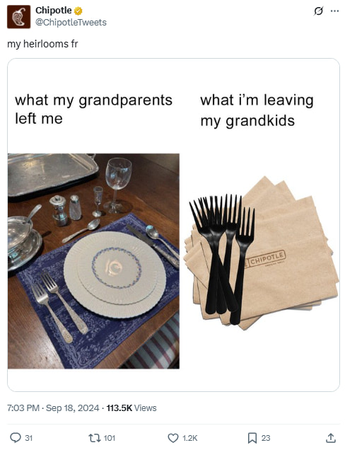 A humorous take on generational wealth—or lack thereof. Chipotle flatware becomes a legacy in this hilarious meme about modern-day priorities.