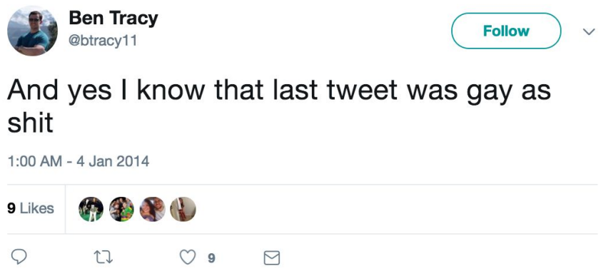 This tweet includes a homophobic slur, even though it was framed as a joke. Using discriminatory language in any context is inappropriate. It shows how casually offensive terms were used in Tracy’s tweets, which is unacceptable and contributes to a harmful tone.